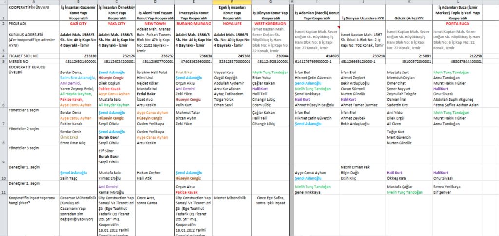 Kooperatif yönetimlerinde yer alan kişilerin karmaşık ilişkileri ve Kooperatiflerin Şenol aslanoğlu’nun kişisel adresinde kurulmuş olması.